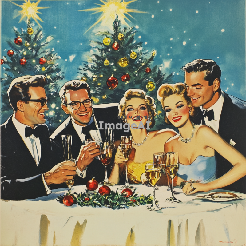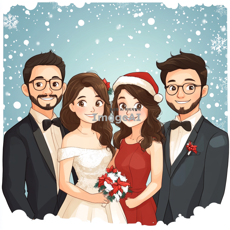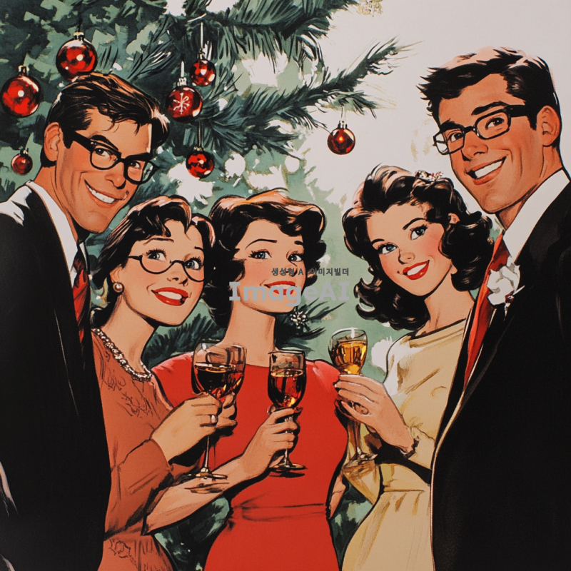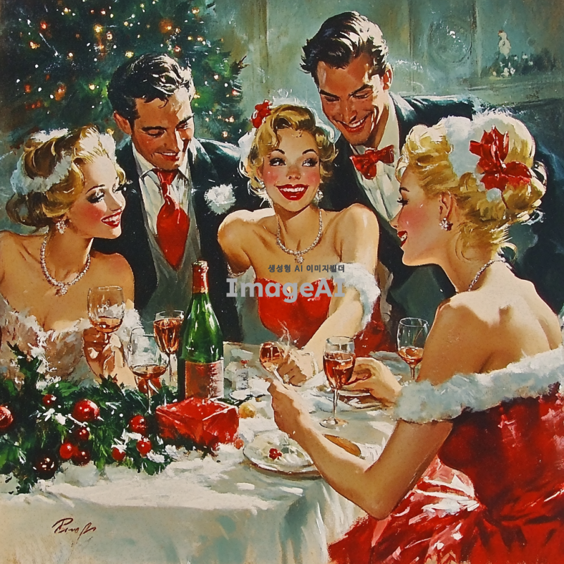 3명의 여자와 4명의 남자가 모여서 크리스마스를 보내는 그림을 그려줘