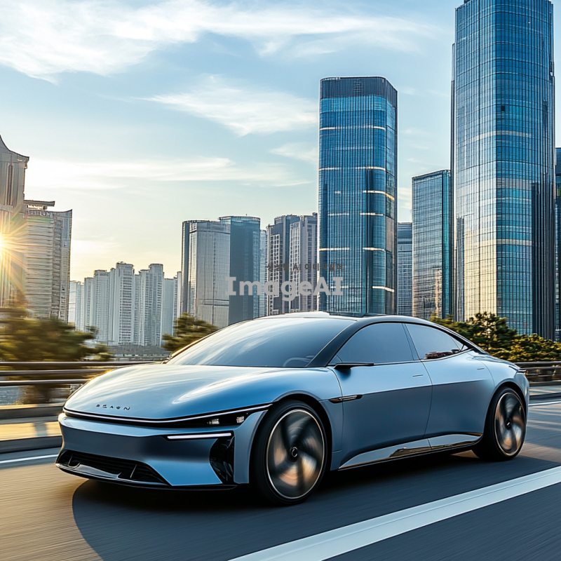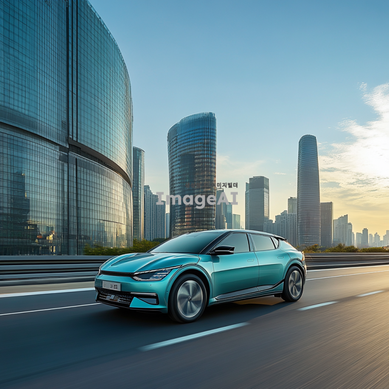 한국의 현대적인 도시 풍경 속에서 세련된 디자인의 전기 자동차가 도로를 주행하고 있는 모습, 차량의 곡선미와 반사되는 빛을 강조하며, 배경에는 고층 빌딩과 푸른 하늘이 어우러진 장면, 자동차의 색상은 매력적인 메탈릭 블루, 여유로운 오후의 햇살이 비치는 분위기.