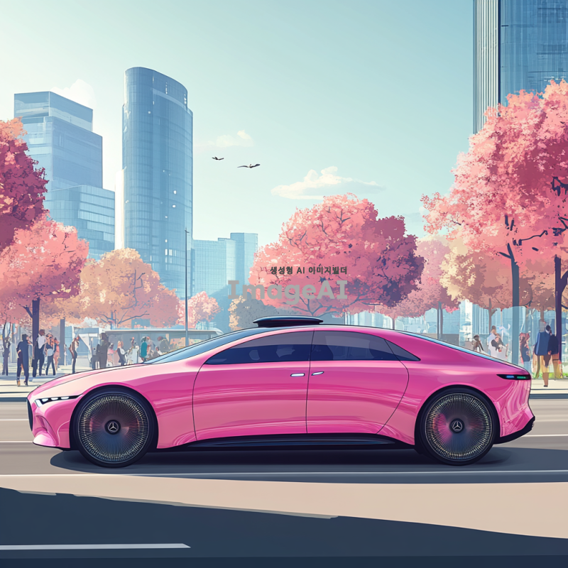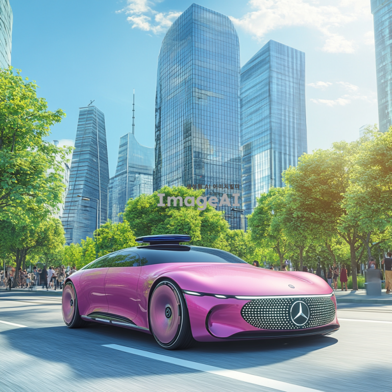 핑크색 벤츠 자율주행차가 도로를 주행하고 있는 모습, 현대적인 도시 배경, 햇살이 비치는 날, 주변에 사람들과 나무가 있는 풍경, 차량의 세련된 디자인과 색상이 강조되도록.
