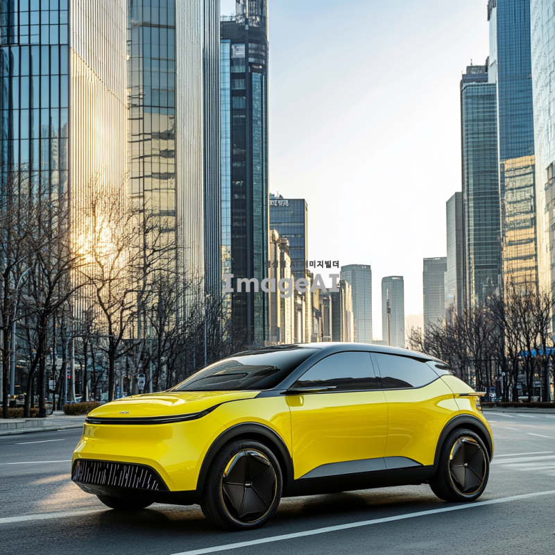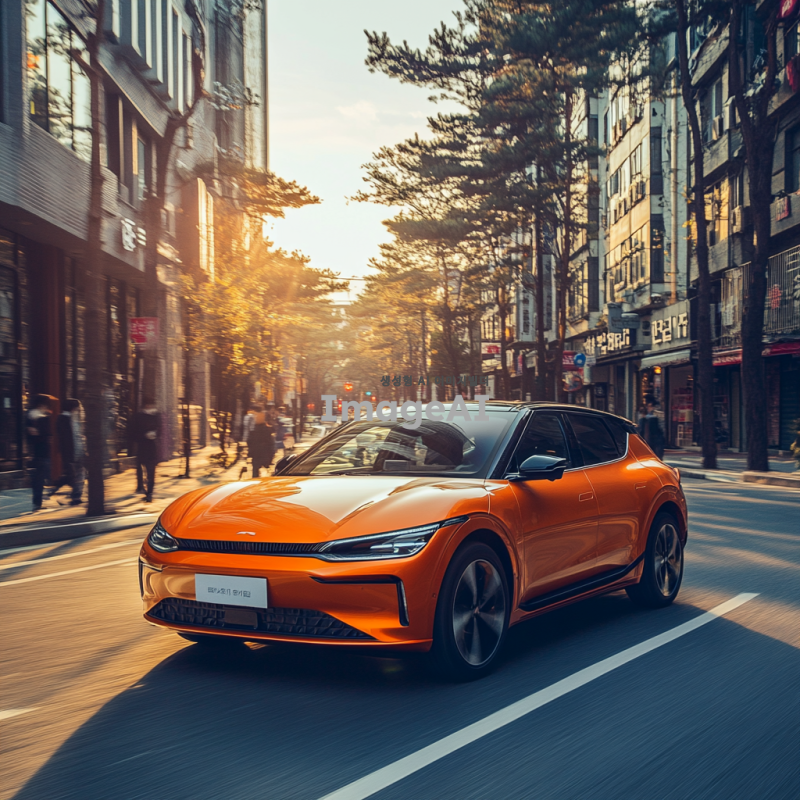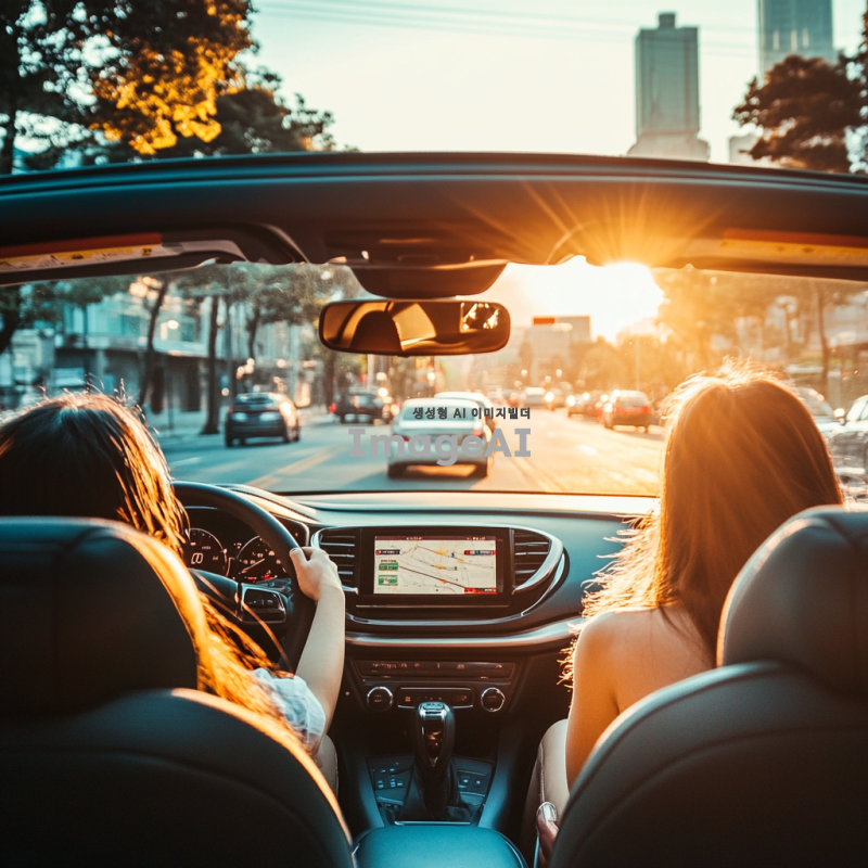 20대의 한국인이 타고 다니는 스타일리시한 차, 현대적이고 세련된 디자인, 도심의 거리에서 주행하는 모습, 밝은 색상, 젊고 활기찬 분위기, 주변에 친구들과 함께하는 모습, 자연광이 비치는 날씨, 차의 내부가 보이는 각도, 자유롭고 즐거운 느낌