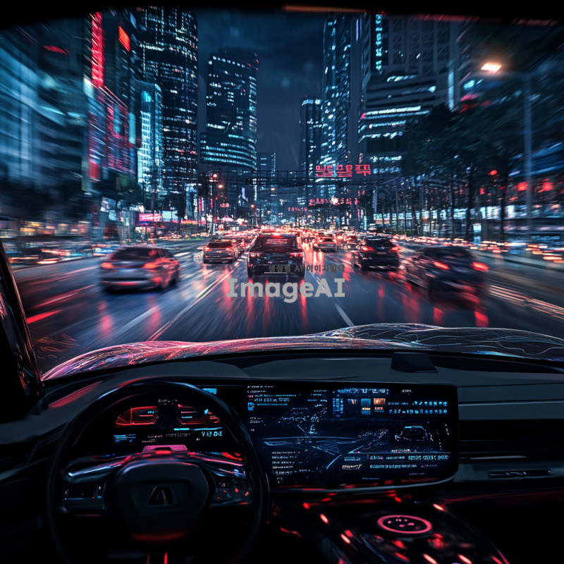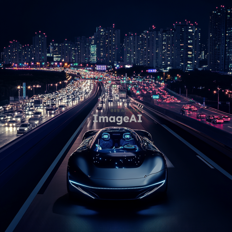 한국의 도시에서 자율 주행 스포츠카가 도로를 주행하는 모습, 현대적인 디자인과 세련된 외관, 고속도로의 풍경과 함께 역동적인 주행 장면, 밤하늘의 도시 조명이 반사되는 차체, 미래지향적인 기술이 강조된 내부 모습, 안전 장치와 첨단 기술이 가득한 대시보드, 스포티한 느낌의 차량 디자인, 주변의 다른 차량들과의 조화로운 모습.