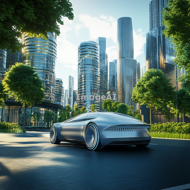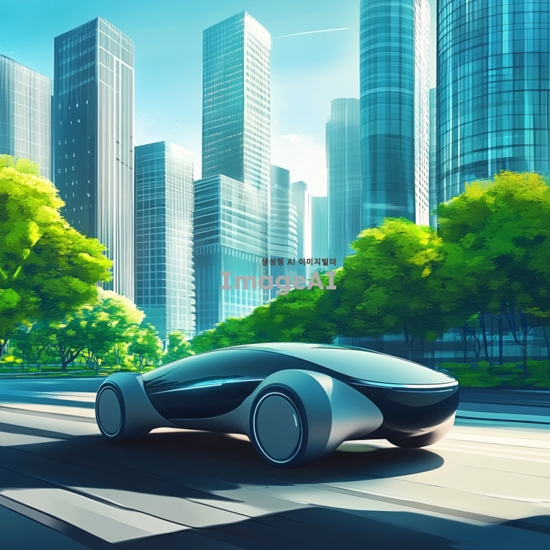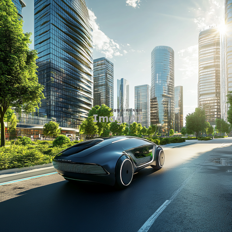 깔끔한 디자인의 자율 주행 자동차가 도시의 현대적인 거리에서 주행하고 있는 모습. 자동차는 매끈한 외관과 미래적인 요소가 결합되어 있으며, 주변은 고층 건물과 푸른 나무들이 어우러져 있는 풍경. 햇살이 비추는 밝은 날씨 속에서 자동차가 부드럽게 움직이고 있는 장면.