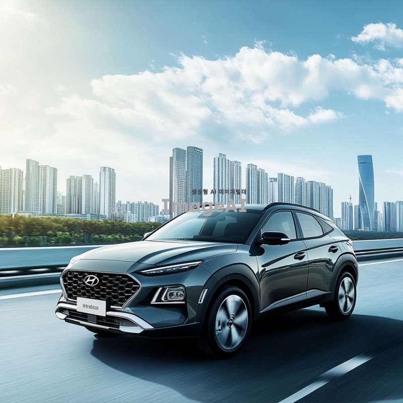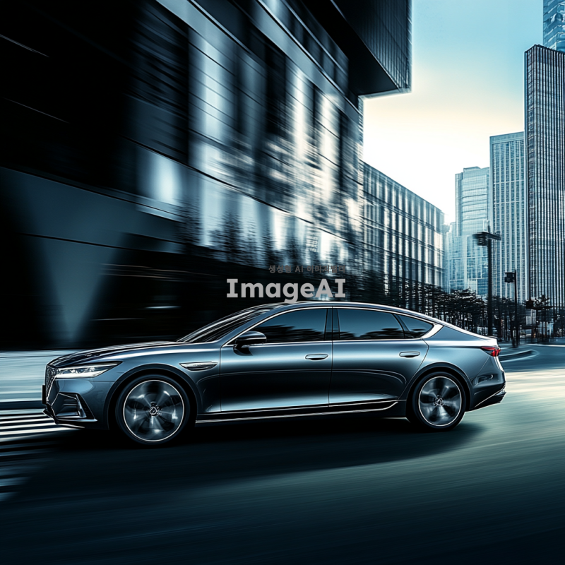 편리하고 깔끔한 디자인의 현대적인 자동차, 부드러운 곡선과 세련된 라인, 실용적인 내부 공간, 고급스러운 소재로 마감된 인테리어, 도시 배경에서 주행 중인 모습, 자연광이 비치는 상황, 한국의 현대적인 거리 풍경.