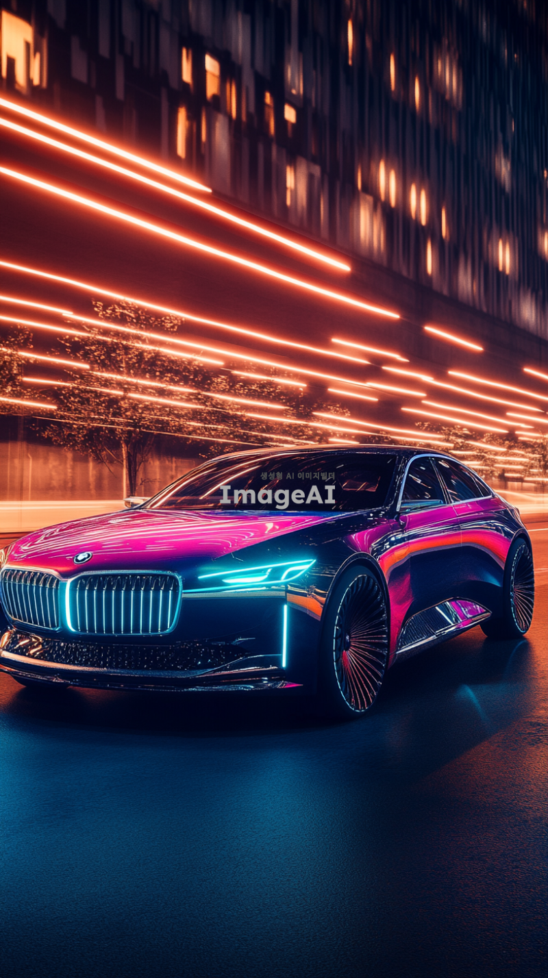 최고급 빛나는 하이브리드 자동차가 여러 색이 섞여 있는 모습, 세련된 디자인과 미래적인 요소가 강조된 외관, 도시의 배경에서 빛나는 조명 아래 주행하는 장면, 고급스러운 느낌을 주는 세부 묘사, 화려한 색상이 조화를 이루며 시선을 사로잡는 이미지.