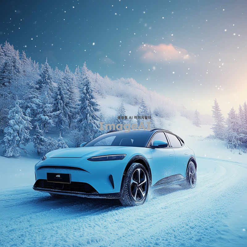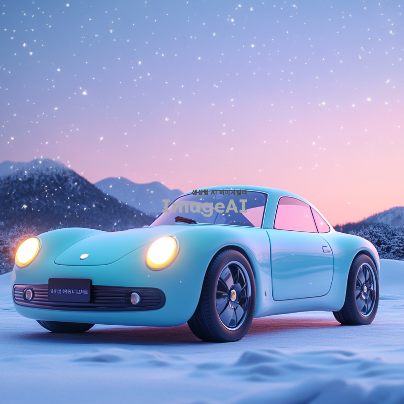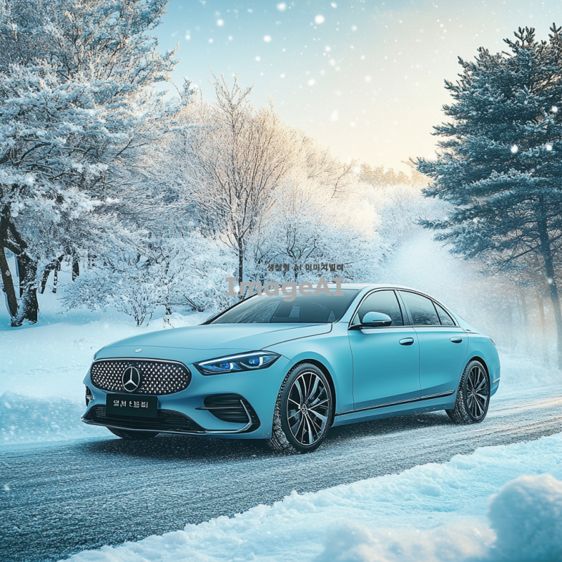 겨울 느낌이 나는 파스텔톤 하늘색 자동차, 부드러운 곡선과 세련된 디자인, 눈이 내리는 배경, 따뜻한 조명, 차가운 공기 속에서 반짝이는 자동차 표면, 겨울 풍경과 조화를 이루는 모습, 한국의 겨울 분위기