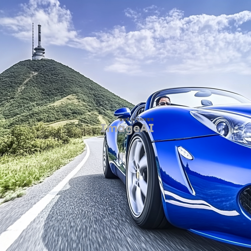 파란색 스포츠카가 도로를 질주하는 모습, 햇살이 비치는 날, 아름다운 자연 경관 배경, 드라마틱한 각도에서 촬영된 이미지, 현대적이고 세련된 디자인의 차, 스포티한 느낌 강조, 한국인 남성이 운전하고 있는 모습, 즐거운 표정으로 바람을 느끼며 달리는 장면.