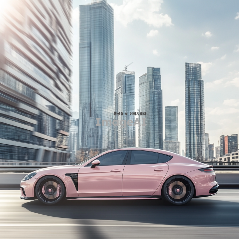 연한 핑크색의 세련된 디자인의 자동차가 도로를 주행하고 있는 모습, 부드러운 햇살 아래 반짝이는 차체, 현대적인 도시 배경, 고급스러운 느낌을 주는 이미지.