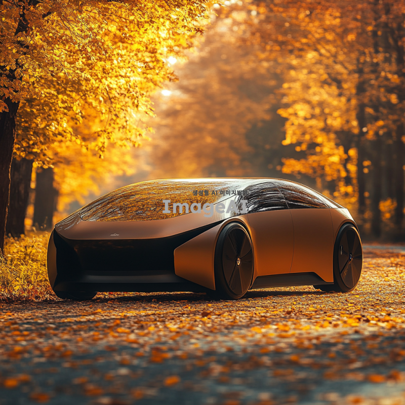 가을 느낌이 나는 브라운색의 깔끔한 디자인의 자율 주행 자동차가 고요한 도로를 주행하고 있는 모습. 주변에는 노란색과 주황색의 단풍이 떨어져 있고, 따뜻한 햇살이 비추는 풍경. 자동차는 현대적이고 미래지향적인 스타일로, 자연과 조화를 이루며 주행하는 모습.