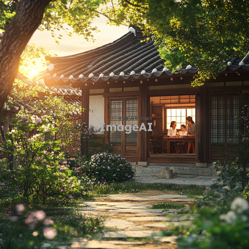 따뜻한 저녁 햇살이 비치는 한국의 전통 가옥 앞마당, 고요한 풍경 속에서 집으로 돌아가고 싶은 마음을 담아낸 모습. 집 안에서는 가족이 함께 웃고 있는 모습이 보이고, 주변에는 푸른 나무와 꽃들이 만발해 있는 따뜻하고 아늑한 분위기. 집 앞에 놓인 작은 벤치에 앉아 하늘을 바라보며 고향의 따뜻함을 느끼는 사람의 뒷모습.