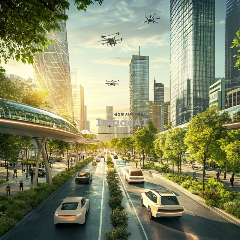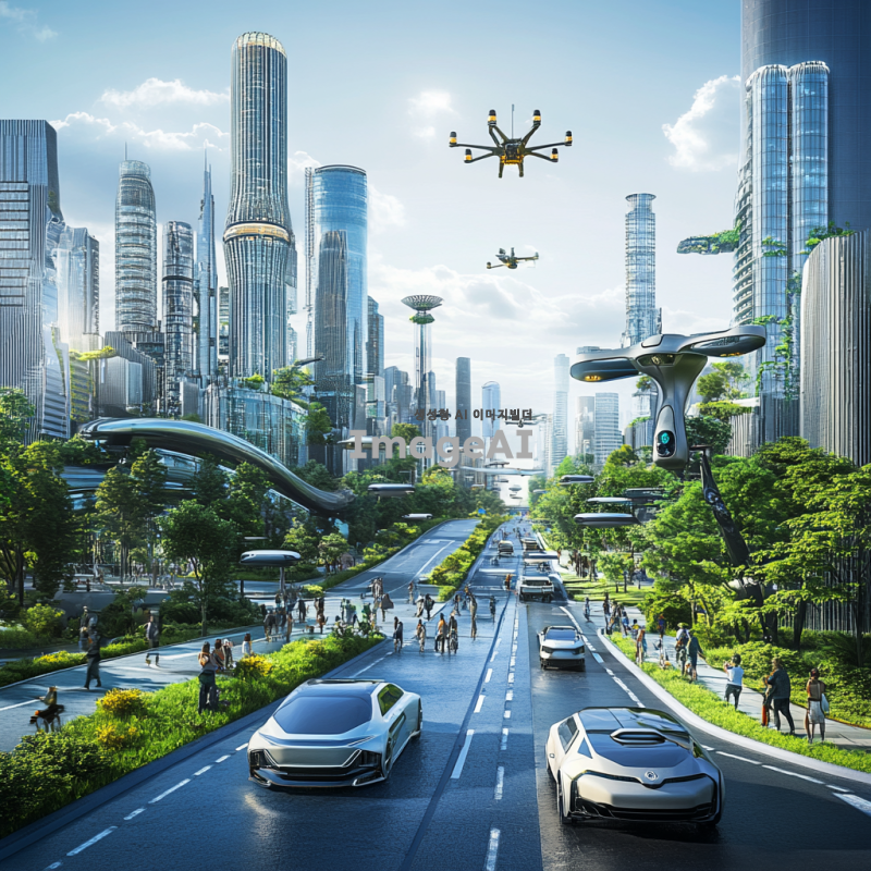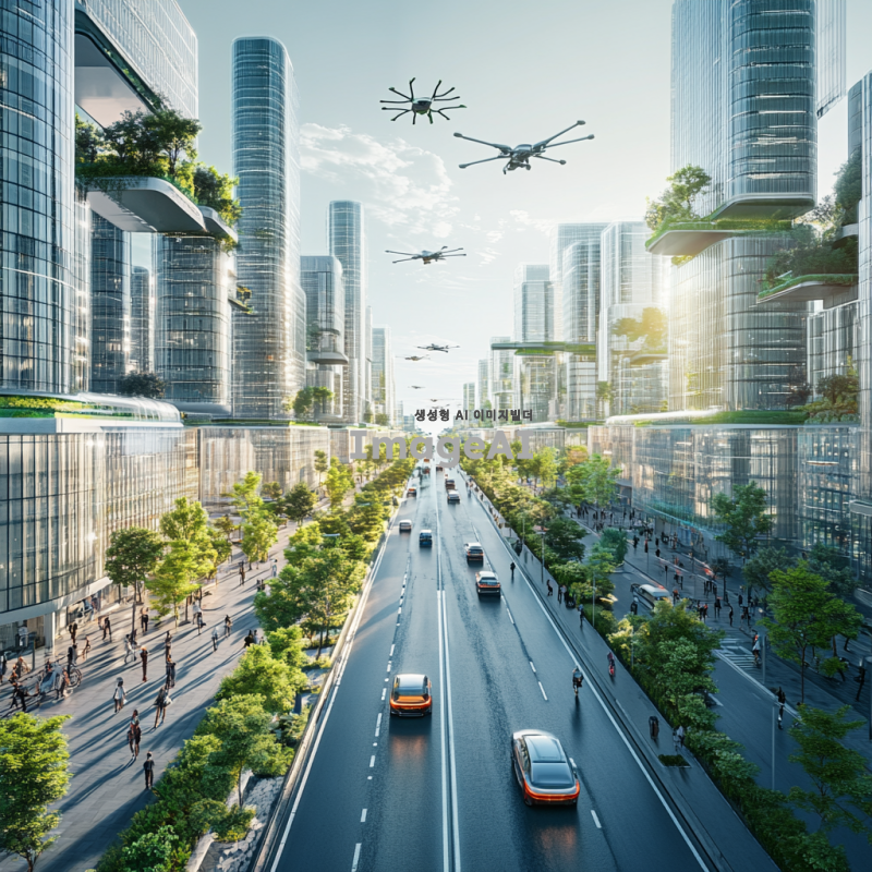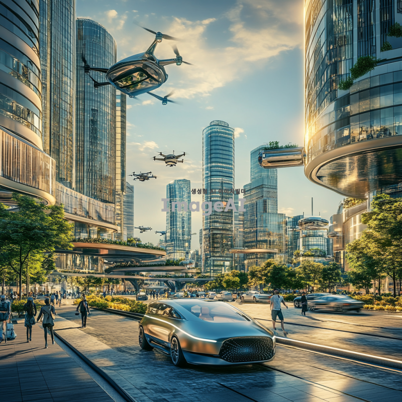 미래도시의 풍경 속에서 자율주행 자동차가 도로를 따라 부드럽게 이동하는 모습, 현대적인 건축물과 초고층 빌딩들이 배경에 자리잡고 있으며, 하늘에는 드론이 날아다니고, 거리에는 다양한 사람들이 활기차게 걷고 있는 장면, 태양빛이 반사되어 빛나는 유리창과 녹색 식물들이 어우러진 친환경적인 도시 풍경.