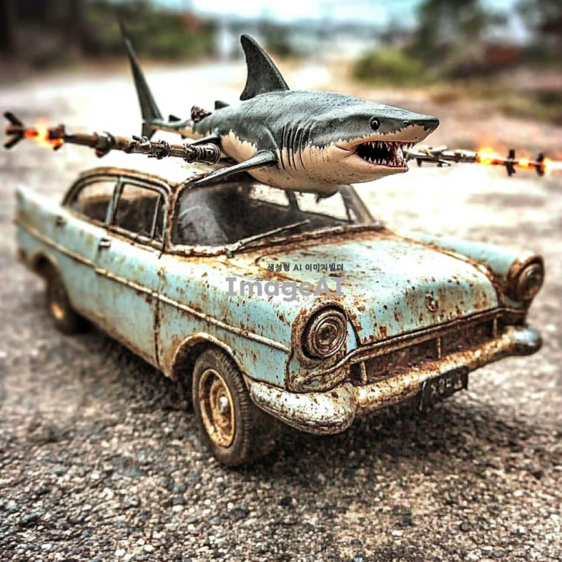자동차위에 상어가있고 상어한텐 레이저 블래스트가 달려있음, 자동차는 바퀴대신에 공룡다리가 달려있음, 자동차엔 비행기 날개가 달려있음