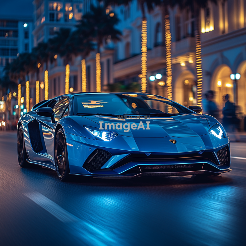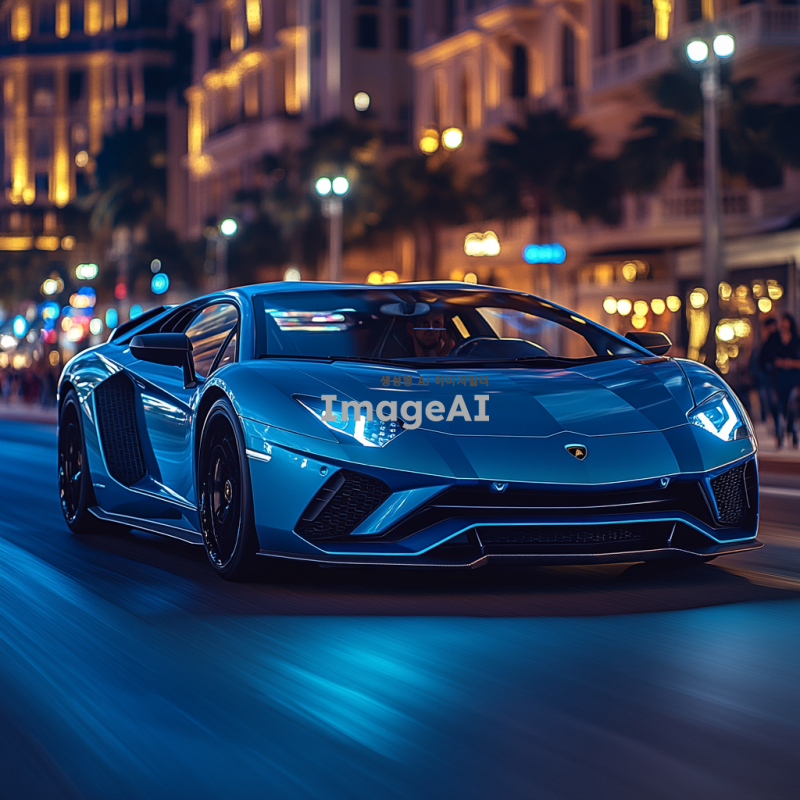 고급스러운 람보르기니 아벤타도르가 도심의 현대적인 거리에서 자율주행 모드로 주행하고 있는 모습. 차량은 세련된 디자인과 독특한 색상을 지니고 있으며, 주변에는 고층 건물과 도시의 불빛이 어우러져 있다. 차체의 반사광이 도로와 주변 환경을 비추고, 차량 내부에는 첨단 기술이 적용된 대시보드와 스크린이 보인다. 배경은 저녁 시간대의 화려한 도시 풍경으로, 사람들은 거리에서 여유롭게 걷고 있다.