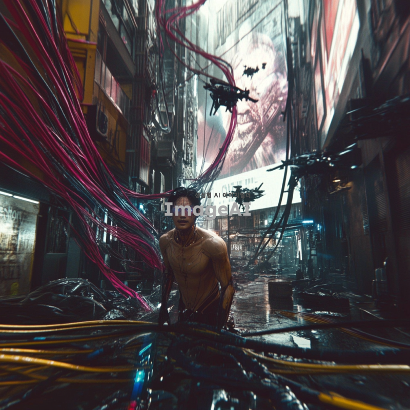 어두운 도시의 미래적 풍경, 네온 불빛이 반짝이는 골목길, 사이버네틱 장치가 장착된 한국인 남성이 홀로 서 있는 모습, 그의 눈은 빛나는 디지털 스크린으로 가득 차 있으며, 복잡한 기계 장치들이 주변에 흩어져 있는 장면, 공중에는 드론들이 날아다니고, 배경에는 거대한 스크린에 광고가 빛나고 있는 모습.