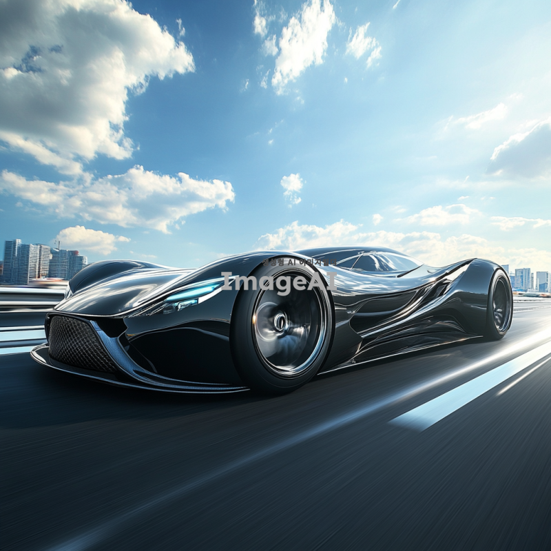 한국의 도로를 질주하는 현대적인 스포츠카, 날카로운 디자인과 유려한 라인이 강조된 모습, 배경에는 푸른 하늘과 함께 도시 풍경이 펼쳐져 있는 장면, 속도감과 역동성을 느낄 수 있는 구도.