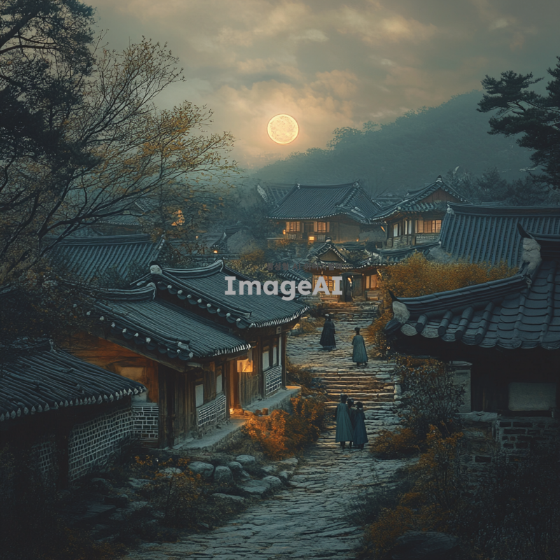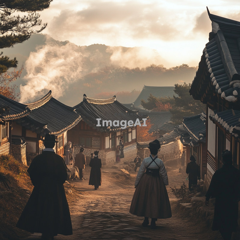 한국의 전통 마을에서 타임피버를 경험하는 사람들, 고풍스러운 한옥과 아름다운 자연 경관이 어우러진 배경, 사람들은 과거의 복장을 하고 있으며, 신비로운 빛이 주변을 감싸고 있는 모습, 따뜻한 색조와 몽환적인 분위기.