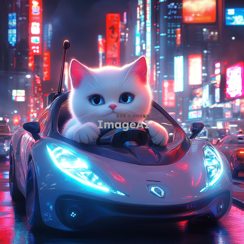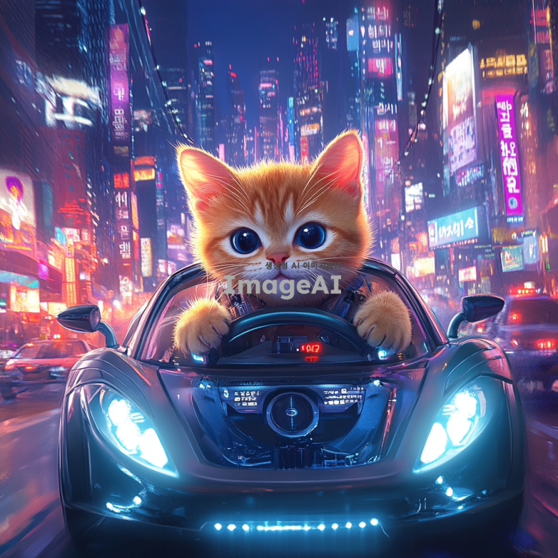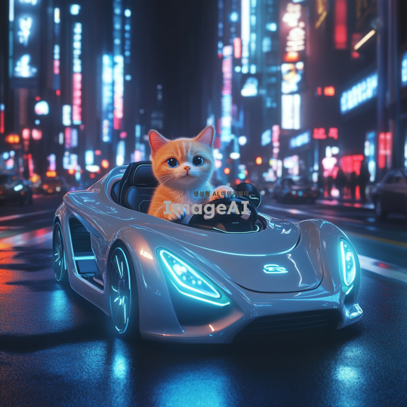 스포츠카 모양의 자율주행자동차 안에 앉아 있는 한국 고양이, 고양이는 운전대에 앞발을 올리고 귀여운 표정을 짓고 있으며, 차의 외관은 세련되고 현대적인 디자인으로, 배경은 도시의 화려한 야경으로 설정되어 있다.