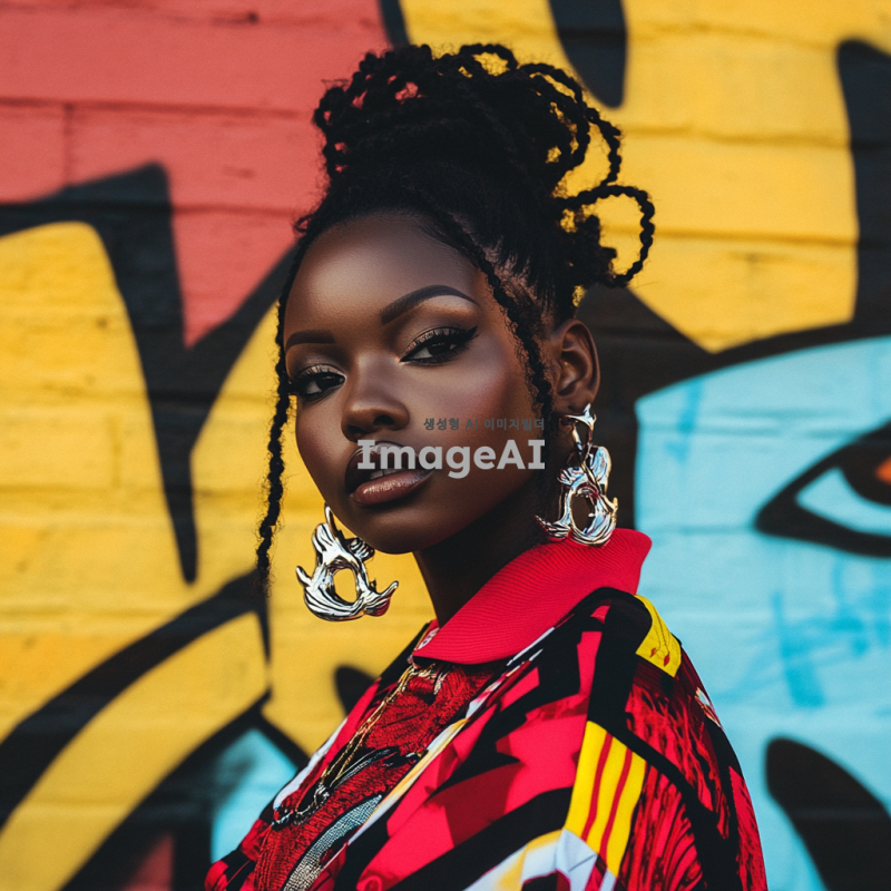 소미가 흑인으로 변신한 모습, 다양한 피부 톤과 아름다운 헤어스타일, 현대적인 패션을 입고 있는 모습, 배경은 도시의 거리, 자신감 넘치는 표정, 다양한 문화의 요소가 담긴 장면, 밝고 생동감 있는 색감
