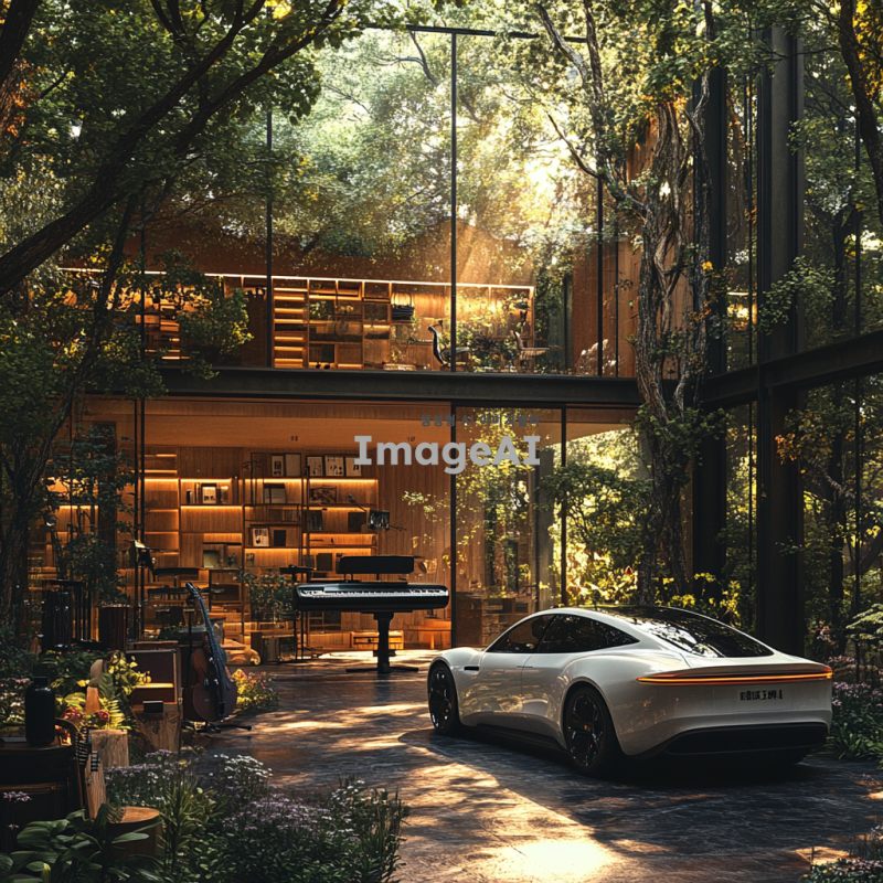 숲속에 위치한 아늑한 음악실, 자율주행 자동차가 창가에 세워져 있는 모습, 햇살이 부드럽게 들어오고 주변에 푸른 나무와 화사한 꽃들이 만개해 있는 따뜻한 분위기, 음악 악기들이 고요히 놓여 있는 공간, 자연과 조화롭게 어우러진 편안한 느낌.