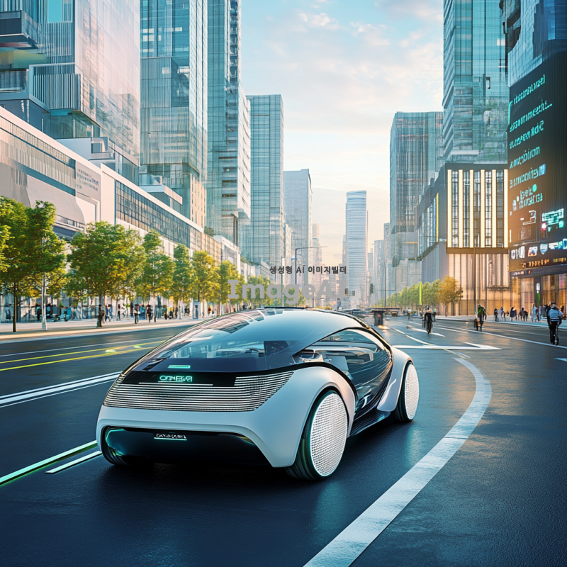 자율주행 자동차가 도로를 주행하는 모습, 현대적인 도시 배경, 다양한 건물과 보행자가 있는 거리, 자동차의 내부 모습이 보이는 각도에서 촬영, 미래적인 디자인의 자율주행차, 안전하고 편안한 분위기, 낮 시간의 맑은 날씨, 자연광이 잘 드는 환경, 기술적인 요소가 강조된 세부 묘사