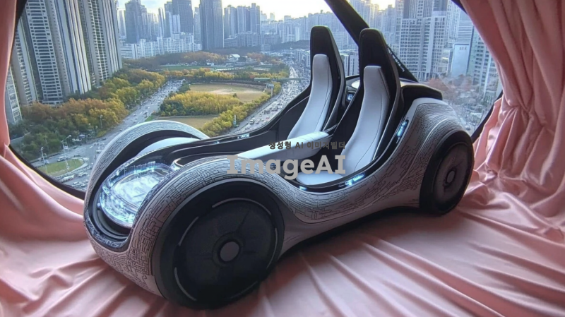 한국의 도심을 배경으로 한 미래형 자율주행차의 모습을 그려줘. 차량은 매끄러운 디자인과 첨단 기술이 적용된 외관을 가지고 있으며, 주변에는 현대적인 건물과 녹지 공간이 어우러져 있다. 차창을 통해 내부에는 편안한 좌석과 고급스러운 인테리어가 보인다. 하늘은 맑고 푸르며, 도로에는 다른 차량과 보행자들이 자연스럽게 공존하는 모습이 담겨 있다.