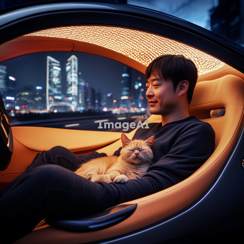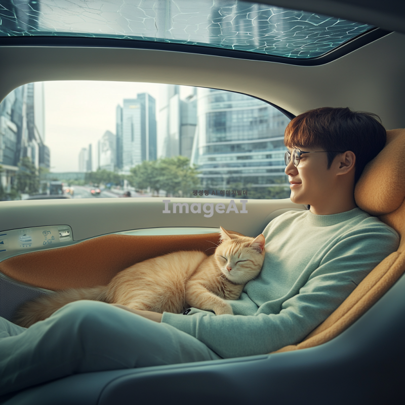 자동 주행 자동차 안에서 고양이를 무릎에 앉히고 편안하게 쉬고 있는 한국 남성의 모습. 자동차 내부는 현대적이고 세련된 디자인으로, 창밖에는 도시 풍경이 펼쳐져 있다. 남성은 편안한 복장을 하고 있으며, 고양이는 편안하게 눈을 감고 있다. 따뜻한 조명이 감도는 분위기.