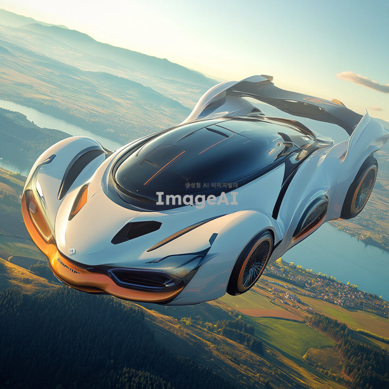 멋진 디자인의 슈퍼카가 하늘을 날고 있는 모습, 공중에서 땅과 물을 동시에 탐험하는 장면, 미래적인 요소가 가미된 독창적인 외관, 유선형의 차체와 화려한 색상, 주변 풍경은 푸른 하늘과 맑은 바다, 그리고 드넓은 초원으로 구성된 이미지.