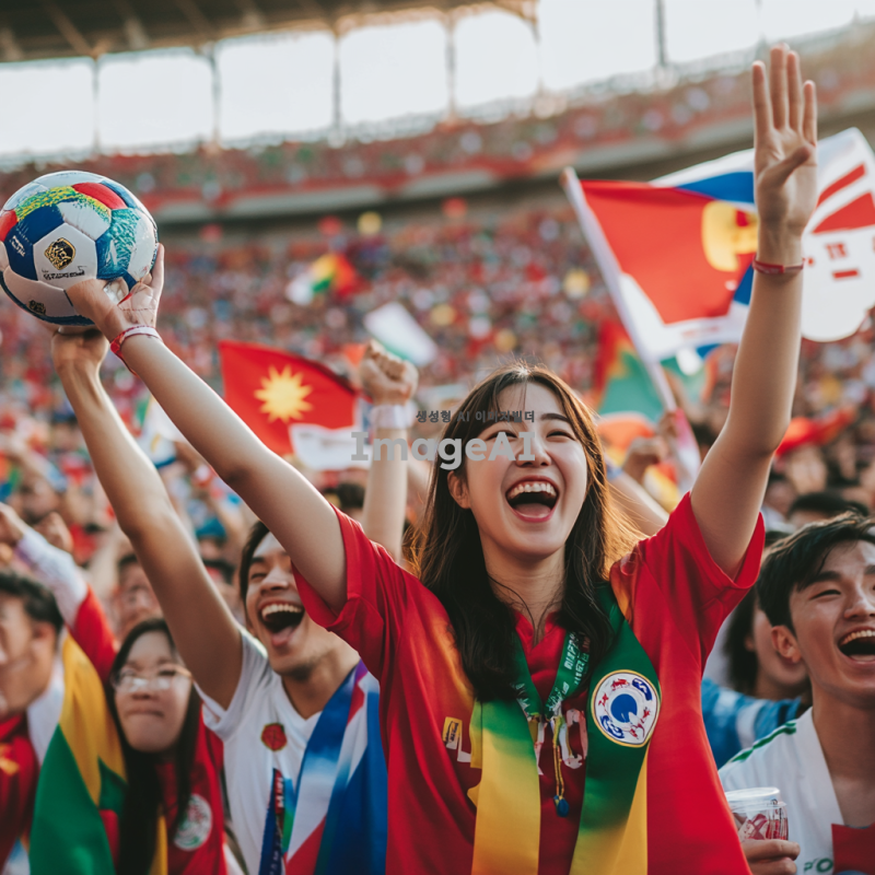 베트남의 축구 경기장에서 열띤 응원을 하는 한국인 팬들, 다양한 팀의 유니폼을 입고 있는 사람들, 축구공과 깃발을 들고 있는 모습, 배경에는 베트남의 도시 풍경과 축구 경기장, 활기찬 분위기와 열정적인 응원 소리, 생동감 넘치는 색감으로 표현된 장면.