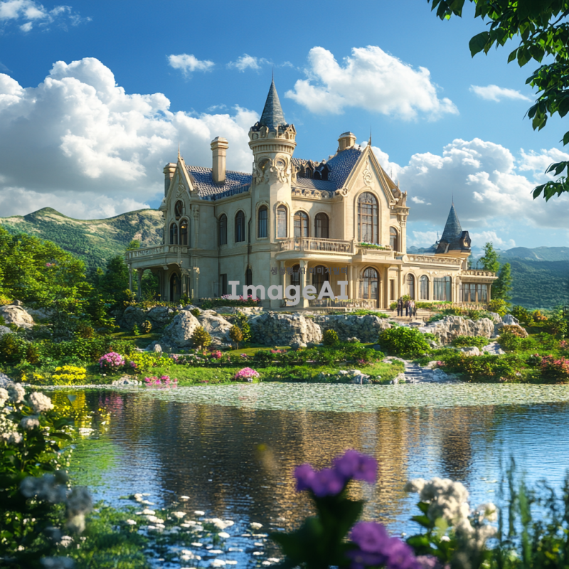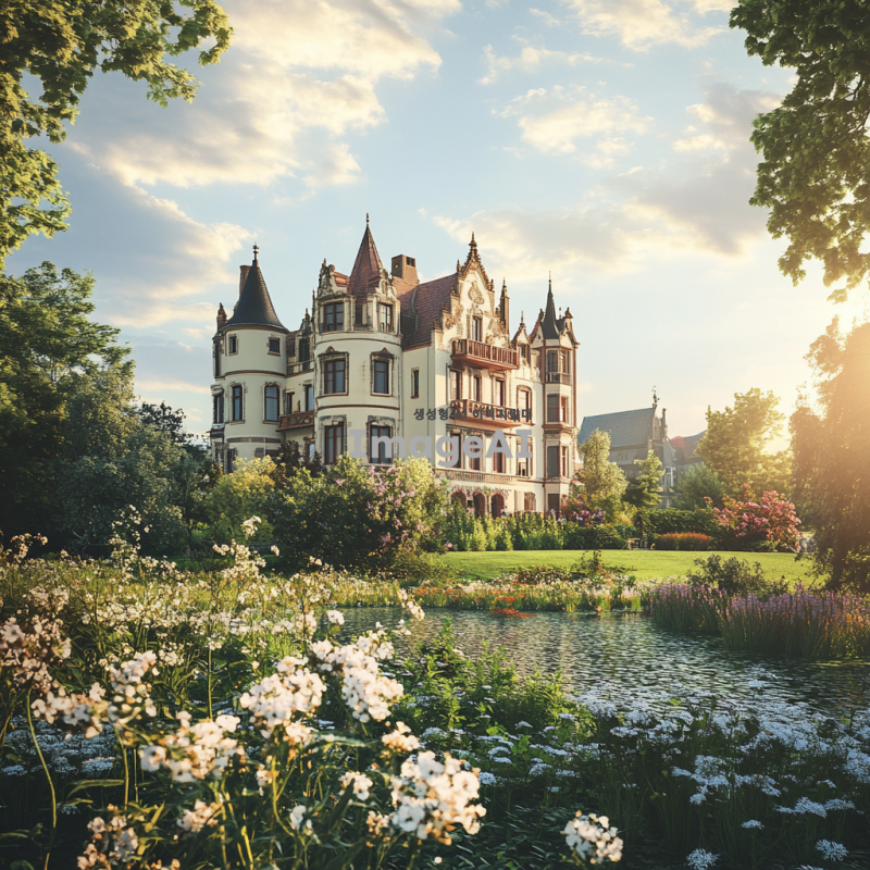 아름다운 경치 속에 위치한 평화로운 성, 푸른 하늘과 흰 구름이 떠 있는 배경, 성 주변에는 꽃이 만발한 정원과 맑은 호수가 있는 모습, 따뜻한 햇살이 비추는 장면, 고풍스러운 건축 양식과 섬세한 디테일이 돋보이는 성의 외관, 조용하고 평화로운 분위기.