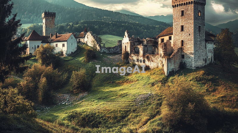 전쟁으로 파괴되고 폐허가 된 중세 성, 잔해와 먼지로 가득 찬 풍경, 부서진 성벽과 무너진 탑, 푸른 식물들이 자생하는 모습, 흐린 하늘 아래 음침한 분위기, 고대의 흔적이 남아있는 잔해들, 전투의 상처가 남아있는 배경