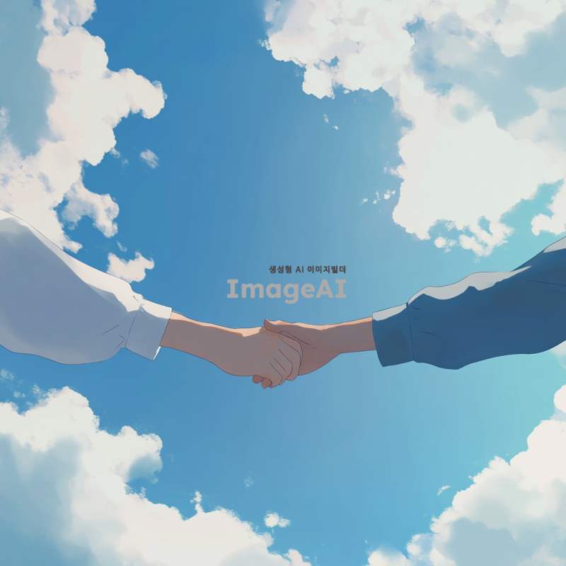 두 사람이 손을 맞잡고 있는 모습, 팔까지만 보이고, 배경에는 푸른 하늘과 흰 구름이 떠 있는 장면, 따뜻한 햇살이 비추는 느낌, 부드러운 색감, 평화롭고 사랑스러운 분위기