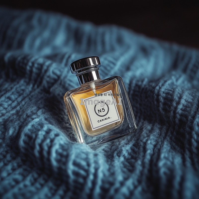 샤넬 넘버 5 향수가 파란색 담요 위에 놓여 있는 장면, 부드러운 자연광이 향수병에 비치며 고급스러운 느낌을 강조하고, 담요의 질감이 잘 드러나도록 촬영된 이미지, 배경은 흐릿하게 처리되어 향수에 집중할 수 있도록 구성.