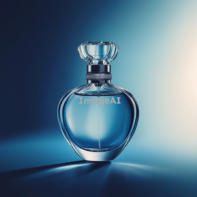 파란색 배경 위에 우아한 디자인의 향수 병이 놓여져 있는 이미지, 향수 병은 세련된 형태와 고급스러운 라벨이 특징이며, 배경은 부드러운 그라데이션으로 처리되어 있어 향수의 매력을 강조함.