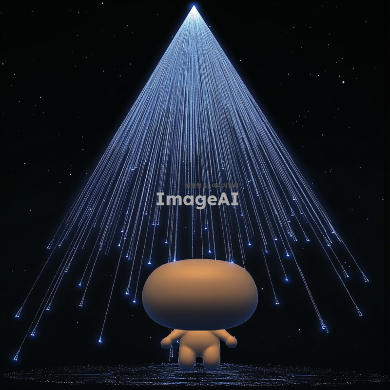 밤하늘에서 홀로그램 쇼를 하고있는데 홀로그램의 모양은 밑에 첨부한 이미지에서 모양만 따서 실제 홀로그램처럼 만들어줘 밑에서 엄청난 빛을 선으로 쏘고있는 듯한 것도 추가해줘