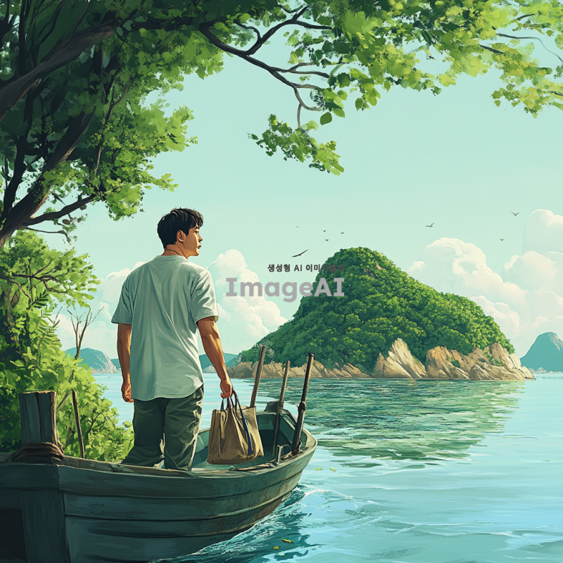 어리둥절한 표정의 한국인 남성이 배에서 내려 무인도로 향하는 장면. 배는 잔잔한 바다에 떠 있고, 무인도는 푸른 나무와 울창한 식물로 가득 차 있다. 하늘은 맑고 해가 비치며, 남성은 간단한 옷차림으로 손에 작은 가방을 들고 있다. 배경에는 멀리 보이는 다른 섬들이 흐릿하게 나타나고, 바다의 파도는 부드럽게 일렁이고 있다.