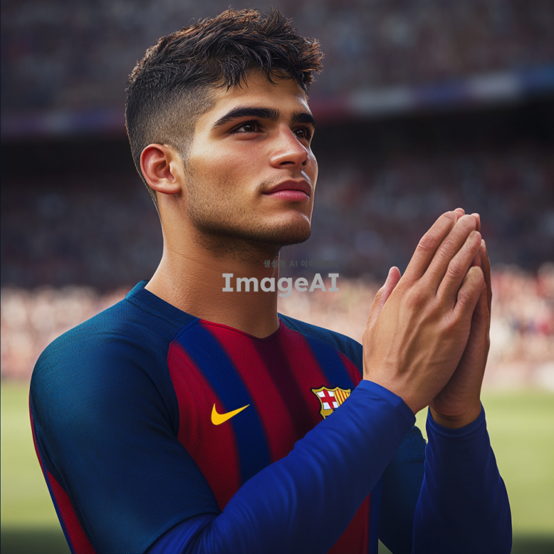 19세의 브라질 축구 선수, 바르셀로나 유니폼을 입고 경기 후 박수를 치는 모습, 짧은 머리 스타일, 남성, 한 사람, 고화질, 하이퍼 디테일, 아름답게 색상 조정된, 놀라운 세부 묘사, 복잡한 디테일, 아름답게 색 보정된, 실제 사진 같은 리얼리즘, 세밀한 머리카락 질감.