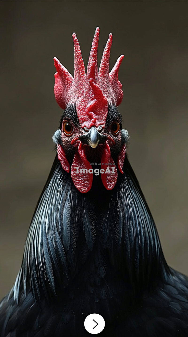 카리스마 넘치는 대한민국 토종닭 수탉의 얼굴을 핀조명으로 강조하여 타이트하게 촬영한 이미지. 수탉의 선명한 검정색 깃털과 강렬한 눈빛이 돋보이도록 하며, 배경은 들판이나 흐릿하게 처리하여 수탉에 집중할 수 있도록 구성.