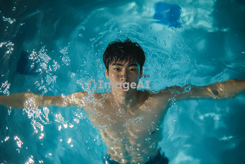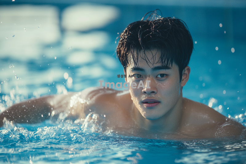 수영장에서 자유형으로 수영하는 한국인 남성, 물이 튀기는 역동적인 순간, 수영복을 입고 힘차게 팔을 저으며 앞으로 나아가는 모습, 수영장 바닥의 블루 타일과 수면 위의 반사된 빛, 생동감 넘치는 표정과 집중한 눈빛, 여름의 따뜻한 햇살이 비치는 장면.