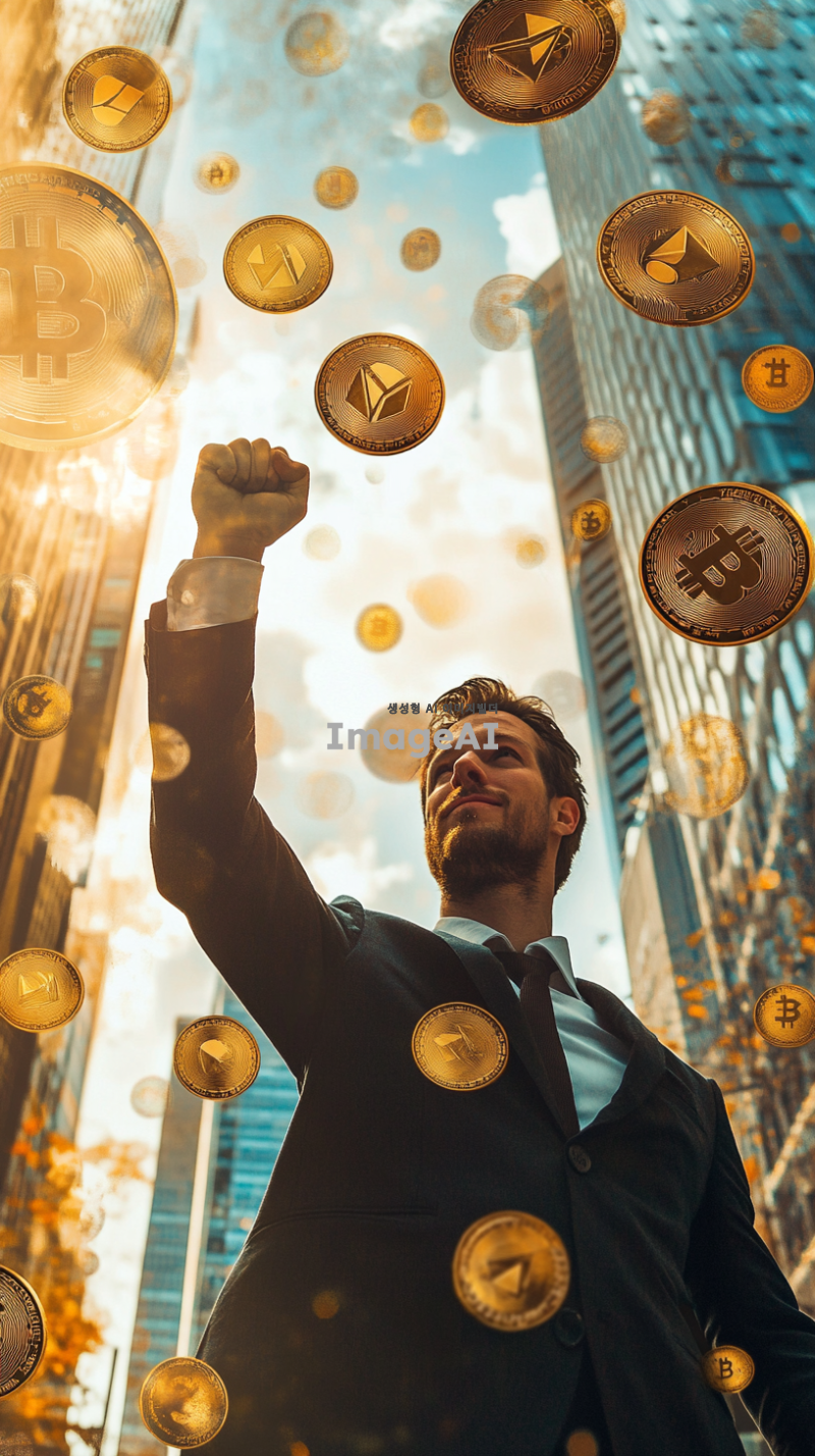정장 입은 남자가 한 팔을 들고 있으며, 올린 팔은 주먹을 쥐고 있는 모습. 주위에는 리플코인이 많이 배치되어 있는 장면. 배경은 현대적인 도시 풍경으로, 트럼프의 표정은 자신감 넘치는 모습.
