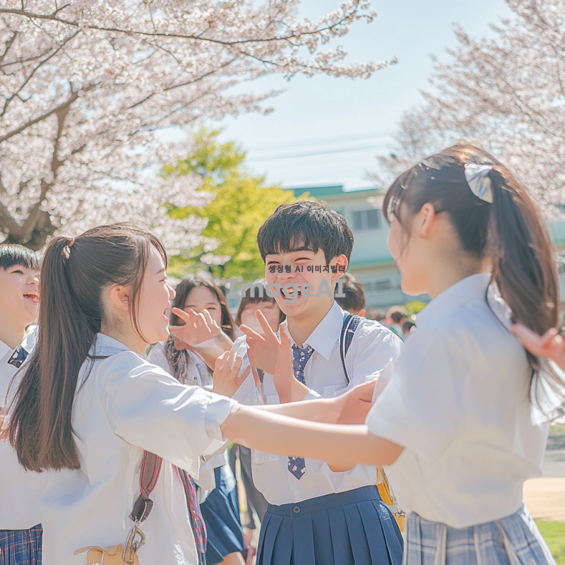 고등학교 1학년을 마무리하는 학생들이 서로를 격려하며 웃고 있는 모습. 따뜻한 햇살 아래, 교실 앞에서 친구들과 함께 기념사진을 찍는 장면. 학생들은 다양한 표정을 지으며 서로의 손을 맞잡고, 배경에는 학교의 푸른 잔디밭과 벚꽃이 만개한 나무가 보인다. 학생들의 옷차림은 자유롭고 편안하며, 서로에게 힘을 주는 듯한 따뜻한 분위기를 강조한다.