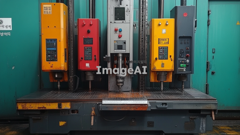 수퍼드릴을 배경으로 한 한국의 현대적인 작업 현장, 다양한 색상의 수퍼드릴이 정렬되어 있는 모습, 강력한 드릴의 디테일이 강조된 이미지, 작업자들이 드릴을 사용하고 있는 모습, 역동적인 분위기와 함께 기술적인 느낌이 나는 장면.