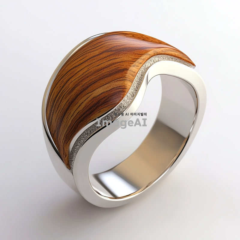 나무결을 강조한 아트주얼리 반지 디자인, 나무와 실버 소재를 사용하여 세련되고 독창적인 형태로 표현, 3D 렌더링, 자연적인 색감과 텍스처, 현대적인 느낌을 주는 스타일, 한국인 디자이너의 감각을 담은 작품.