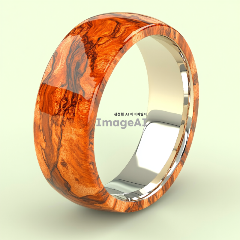 나무결이 돋보이는 나무와 실버를 활용한 아트 주얼리 반지의 3D 디자인. 나무의 자연스러운 질감과 실버의 고급스러운 광택이 조화롭게 어우러진 형태로, 독특하고 세련된 느낌을 주는 반지. 세밀한 나무결과 실버의 디테일이 강조된 모습, 배경은 부드러운 톤으로 설정하여 반지의 아름다움이 더욱 부각되도록.