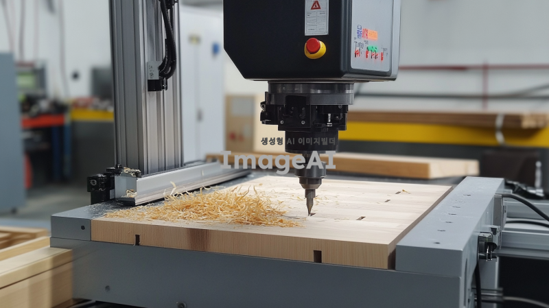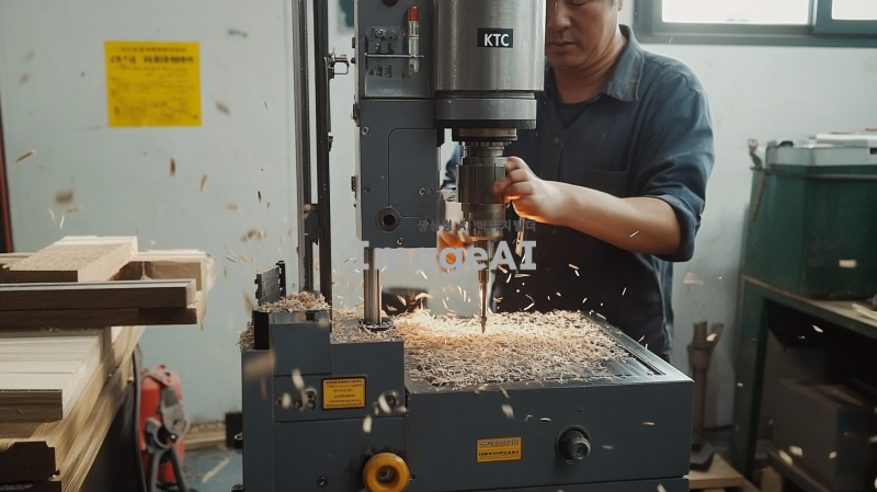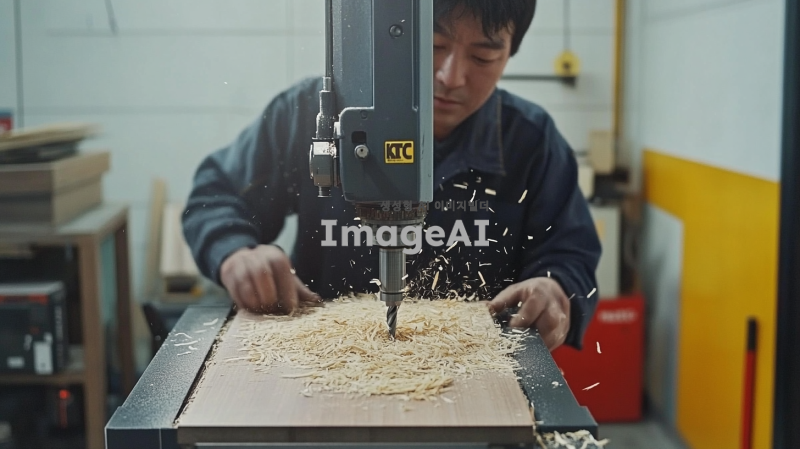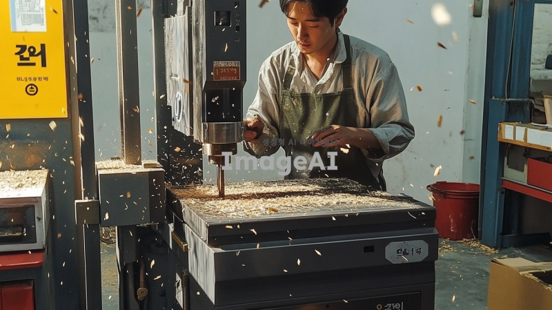 케이티씨 수동 슈퍼드릴 기계가 작동하는 모습, 기계의 세부 사항이 잘 보이도록 클로즈업, 드릴이 나무 표면에 깊이 들어가는 장면, 주변에 나무 조각이 튀어나오고 있는 모습, 작업자가 집중하는 표정, 현대적인 작업 환경, 자연광이 들어오는 공방 분위기, 한국인 작업자, 기계의 금속과 나무의 질감이 잘 드러나도록.