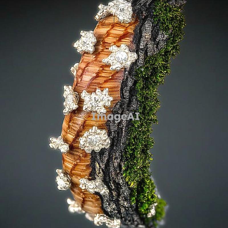 나무와 실버를 조화롭게 결합한 아트 주얼리 반지를 3D로 디자인한 이미지, 자연의 아름다움을 담은 유기적인 형태와 섬세한 디테일, 따뜻한 나무의 질감과 차가운 실버의 반짝임이 어우러진 독특한 반지, 배경은 간단하고 우아하게 설정하여 주얼리의 아름다움이 돋보이도록 표현.