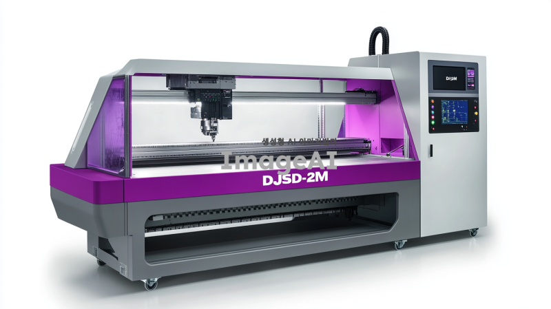 - 고속 CNC 기계로, 고립된 흰색 배경, 보라색과 은색 색상 조합, 앞면에 검은색 글씨로 "DJsD-2M"이라는 큰 텍스트가 있습니다. 오른쪽 위에 큰 디지털 디스플레이가 있으며, 내부를 비추는 LED 조명이 있습니다. 아래쪽에는 바퀴가 달린 회색 금속 받침대가 있고, 제어 패널 아래에는 컴퓨터 인터페이스가 있습니다. 왼쪽에는 검은색 전원 코드가 내려오고, 테이블 상단 아래에는 도구나 장비를 위한 금속 창이 있는 트레이가 부착되어 있으며, 현대 산업적인 외관을 가지고 있습니다.