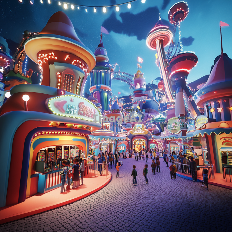 환상적인 놀이동산의 매표소를 3D로 표현한 이미지. 화려한 색감과 독특한 디자인의 건물, 주변에는 다양한 놀이기구와 즐거운 사람들, 밝은 조명과 축제 분위기가 느껴지는 장면. 매표소 앞에는 긴 줄을 서 있는 아이들과 가족들, 즐거운 표정으로 티켓을 구매하는 모습. 전체적으로 환상적이고 꿈 같은 느낌을 주는 이미지.
