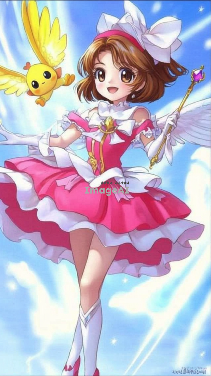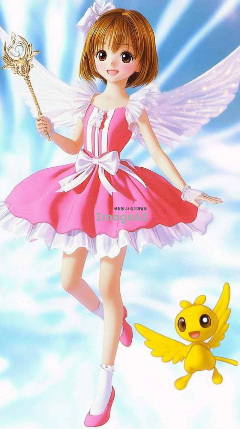 밝고 활기찬 표정을 가진 젊은 한국 소녀가 화려한 분홍색 마법 의상을 입고 있습니다. 의상에는 흰색 포인트와 함께 부풀린 치마, 리본 장식이 포함되어 있습니다. 그녀는 날개가 달린 마법 지팡이를 들고 있으며, 짧은 갈색 머리와 따뜻한 미소를 지니고 있습니다. 그녀 옆에는 작은 노란색 날개 생물이 행복하게 떠 있습니다. 배경은 부드러운 흰색과 파란색 스트라이프가 어우러진 역동적인 하늘로, 마법적이고 환상적인 분위기를 강조하고 있습니다.