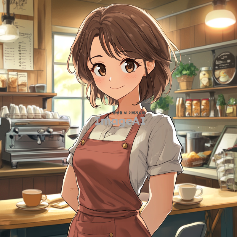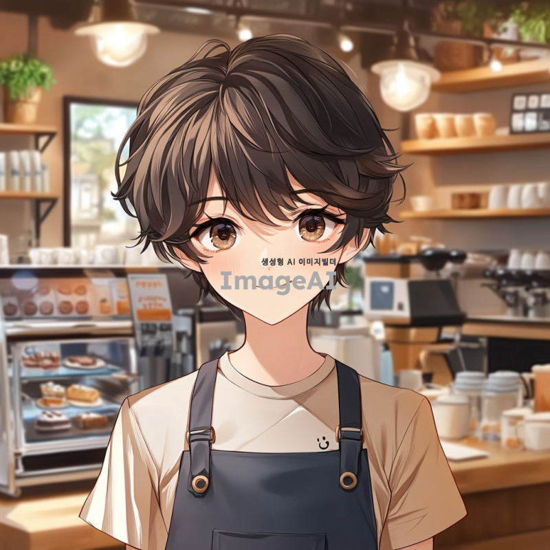 짧은 머리에 친절해 보이지만 못된 카페 알바생 카페 내부의 아늑한 분위기, 다양한 커피와 디저트가 놓인 테이블, 약간의 장난스러운 표정