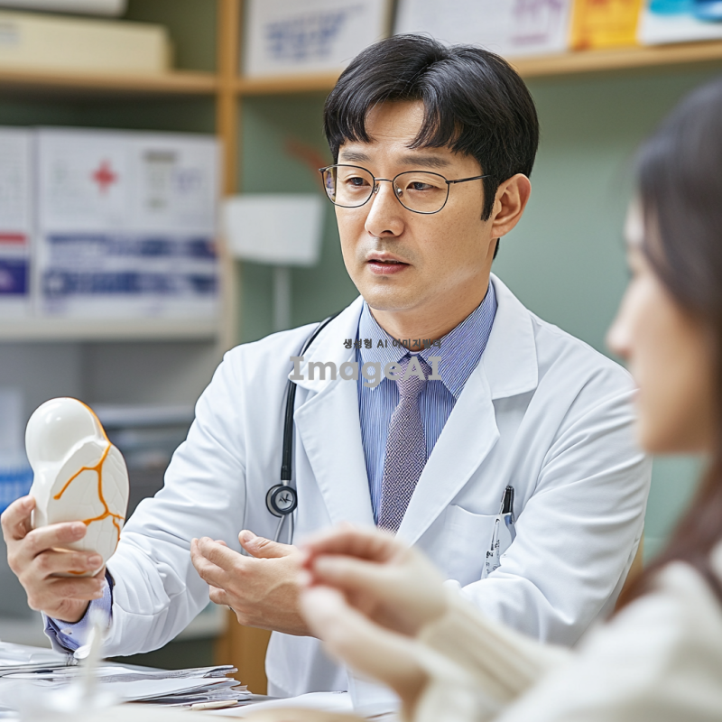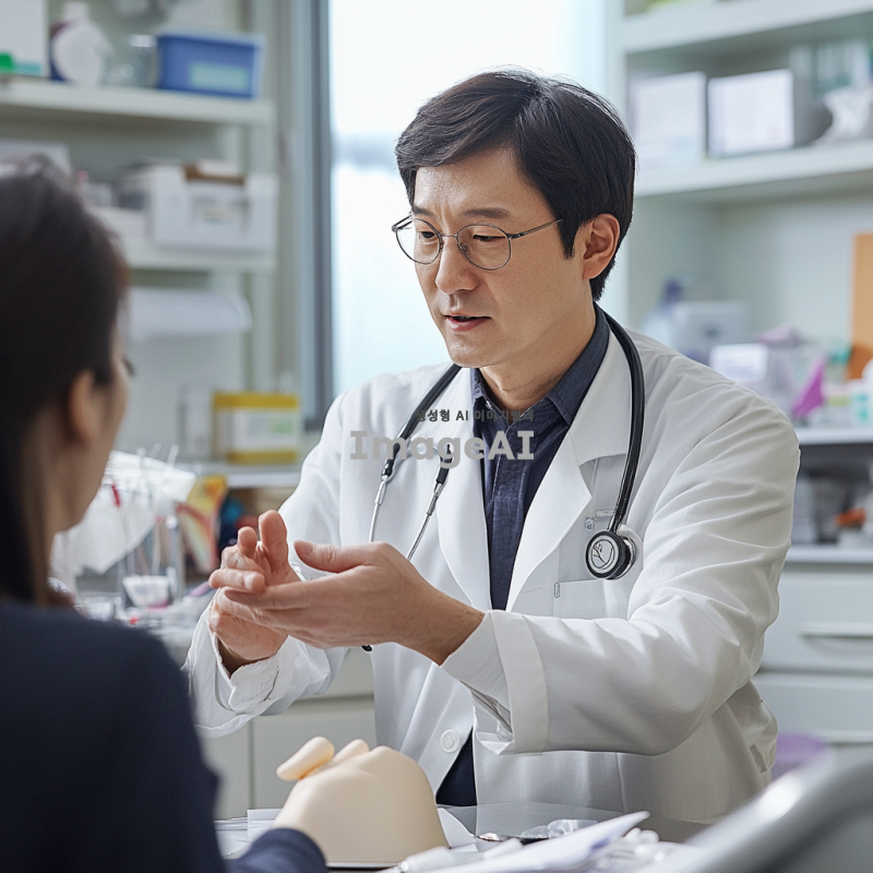 테니스 엘보우 치료를 진행하고 있는 한국인 의사 모습, 팔꿈치 모형을 활용하여 환자와 상담하는 장면, 진료실 배경, 의사가 진지한 표정으로 설명하는 모습, 의료 도구와 자료가 있는 환경, 전문적인 분위기.