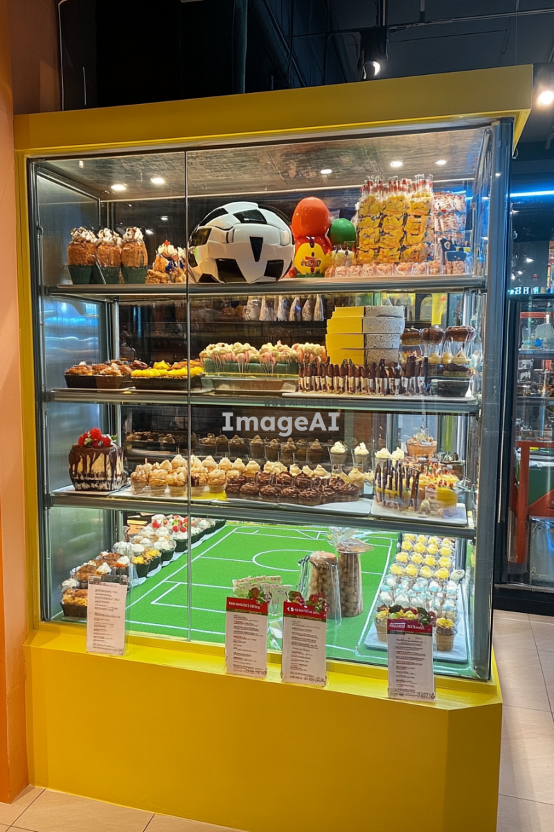 3층짜리 디저트 쇼케이스가 축구장 느낌으로 꾸며져 있고 쇼케이스 내부는 디저트 안내 pop로 진열되어 있는 사진